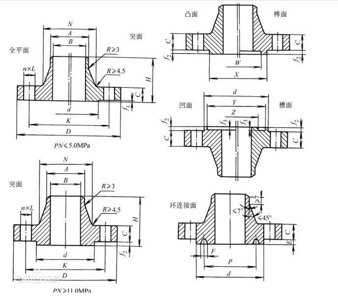 對焊法蘭應(yīng)按公稱通徑,公稱壓力,密封面形式代號,配用的鋼管系列代號(配用米制管代號為“系列2”,配用英制管不標(biāo)記)和標(biāo)準(zhǔn)編號進(jìn)行標(biāo)記.